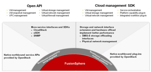 北向开放方面,Fusionsphere提供了标准的API,上层应用可以根据业务需求灵活调度虚拟化的计算、存储、网络资源,真正实现了业务驱动基础设施。除了API,Fusionsphere还提供兼容CloudStack接口;提供eSDK整合OpenStack接口以方便开发者调用;提供SNMP接口实现网络管理。