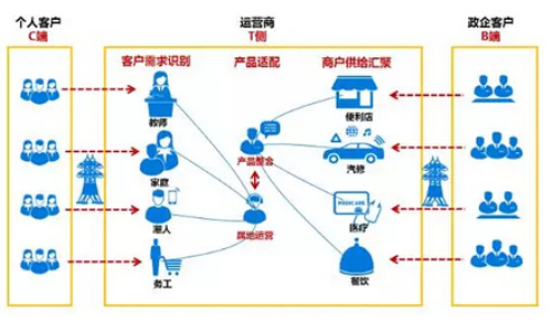 连接个人客户与政企客户两端需求,引导供给的B2T2C商业模式,核心是资源整合,将个人客户、政企客户与运营商的各类资源整合到一个平台中,从而驱动供给两端。