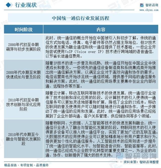 2010年代中期至今的融合与智能化发展阶段,随着物联网、大数据、人工智能等技术的快速发展和融合,统一通信行业进入了融合与智能化发展的阶段。物联网技术的引入使得更多设备可以接入统一通信平台,实现了更加广泛的互联互通。大数据技术的应用使得企业可以更加精准地分析用户需求和行为,提供更加个性化的通信服务。人工智能技术的应用则进一步提升了统一通信的智能化水平,如智能语音识别、智能客服等。此时,统一通信已经成为企业数字化转型的重要支撑之一,为企业的沟通、协作、创新提供了强大的技术支持。