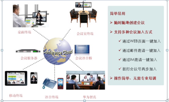 华为提供了经过专门设计和测试的融合解决方案,将智真、硬件、软件、电话等任何会议形式融合在一起实现在办公室、会议室、家中、户外等任何位置,使用台式机、笔记本、智能手机、平板电脑、固定电话等任何设备将员工、合作伙伴和客户紧密的联系在一起,实现实时的交流协作。