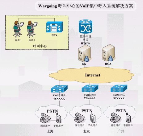 许多公司的客户群分布在的全国各地一些地方,而仅仅在公司总部设一个呼叫中心。如果采用800号码接入,公司需承担很多的费用;而采用呼叫中心所在地的号码接入,外地的客户需承担长话费用,影响客户的热情。上海伟功公司推出的Waygoing 呼叫中心的VoIP集中呼入就可以很好的解决这一难题。