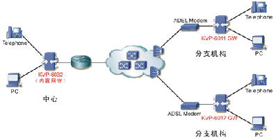 在各个分支机构,只需在ADSL Modem之后配置一台VoIP网关,网关的电话接口数量或中继数量根据企业的实际情况选择。图中为分支机构配置了KVP6011和KVP6017两种VoIP网关,分别可提供4路和8路电话或中继,适合于小型分支机构的应用。