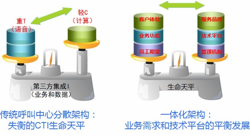一体化架构,解决了传统呼叫中心架构的不平衡。是一种动态的生长、适应和实现的平衡方式,是一种持续改进的机制。面对客户业务发展和变化时,可以做到随需而变、动态发展,而不影响整体系统的稳定性。