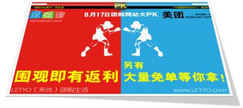 继发布首份权威详实的行业调查分析报告——《中国网络团购市场研究报告》后,国内专业团购导航网站LETYO(来优)团购生活网,今日又召集众多主流团购网站线上“PK”,由网友投票一决高下。由于各家团购网站均希望在中国首次的团购网“武林大会”上脱颖而出,因此均拿出了各家优势资源积极参与。据悉,8月17的首场PK秀,将由中国首家团购网站“美团网”和素有团购业“黑马”之称的“现在团”的对决拉开序幕。