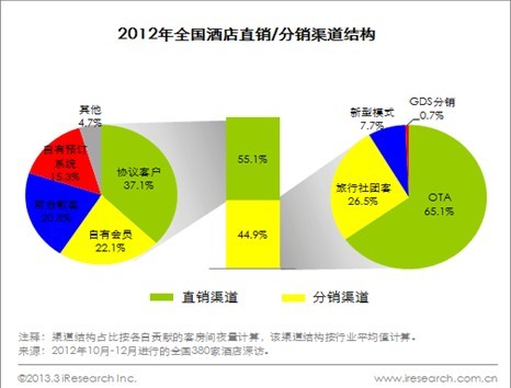 2012年全国酒店客房销售渠道中,通过直销和分销售出的间夜量分别占55.1%和44.9%。总体而言,直分销渠道销量占比均衡,直销比例略高。进一步分析,酒店销售渠道呈现以下三大特点:1、直销各渠道以协议客户为主,分销渠道销量以OTA为主;2、不同类型酒店销售渠道差异化显著;3、新型模式仅为补充渠道,酒店态度偏谨慎。