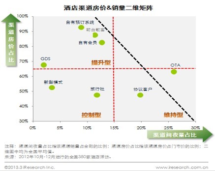 艾瑞咨询认为,按照渠道房价和销量两个重要指标交叉分析,酒店销售渠道呈以下三种发展态势: