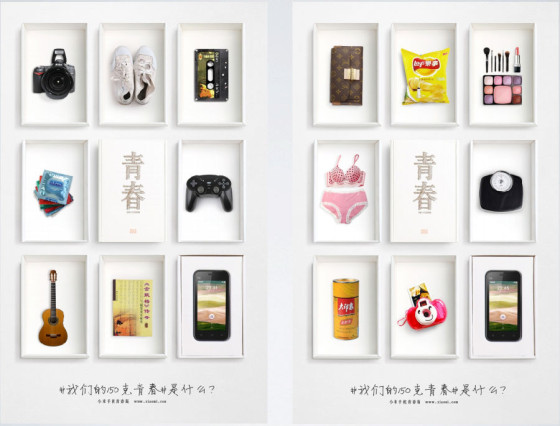 那个时候还有一些海报,海报里的元素非常多,有男生感兴趣的游戏机、照相机,臭球鞋,还有女生感兴趣的化妆品,体重计,甚至还有大印象减肥茶……总之是能够让人一眼就看到青春的感觉。这是我们的包装盒,整体是走青春、文艺的调调。