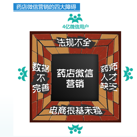 所谓软件,是指我国药店的服务营销思维需要转变——从“让更多人知道”,转变为“让有需求的人群知道,为需要的人提供产品和服务”。微信,就是这种精确营销的理想工具。药店已经在微信模式上进行了探索,可以说是个新的开始。但在国内还处于起步阶段的医药电商在移动端仍然较为落后,更不用说传统药店。微信营销模式的探索固然是药店的大势所趋,然而也存在固有的现实障碍——微信营销普及的硬件尚未齐备。