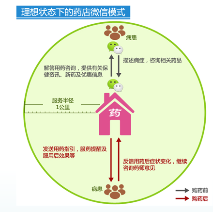 药品与其他商品有所不同,其他用品消费者可以自己决策,药品则不同,交易中必须嵌入一小段专业的医药类服务:买卖医药商品需要咨询,需要不断的交流,需要跟踪和反馈。因此专业服务下的药品买卖,一定基于服务的O2O模式,即互联网电商平台加上传统的门店相互融合,微信则是实现从第一个O(线上)到第二个O(线下)的理想途径。