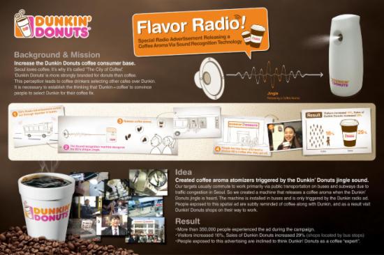 Dunkin’Donuts的公交车咖啡香味广播机,运用嗅觉与听觉,成功吸引上班族到店消费,使车站附近商店增加29%的销售额!不从眼睛而从鼻子抓住你的心,挡都挡不住!