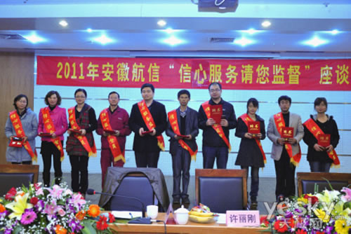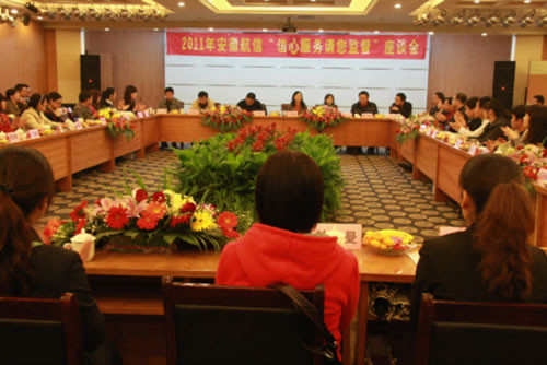 10月28日,2011年安徽航信“信心服务 请您监督”座谈会在合肥市电子工程学院交流中心三楼会议中心召开。尽管外面寒风瑟瑟,秋雨绵绵,但温馨的会场、热情的安徽航信人让参会人员倍感亲切。公司总经理李海波、财务总监周唐、总经办主任包万芝、客户服务管理事业部总经理袁小平、服务经理吕蓓等参加了会议。合肥市国税局货物与劳务处副处长许丽刚、纳税服务处副处长李茹、货物与劳务处副处长束庆华、朱其宽、货物与劳务处科长夏传敏、纳税服务处 12366呼叫中心主任张健以及合肥市52户防伪税控用户54位客户代表应邀参加座谈会。