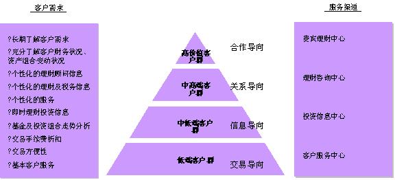 以某证券公司为例,根据客户价值建立客户分级服务体系,制定针对各个层级客户的总体关系管理策略,并持续的研究客户需求,研发服务产品,通过不同层级的服务渠道交付给客户,实现客户价值最大化。
