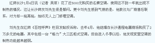 (刘先生购买的格力空调,使用不到一年就出现了不制热。)