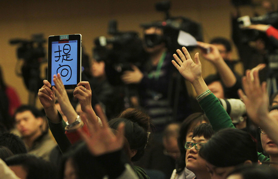 3月9日,住建部新闻发布会上,一名记者举着写有“提问”二字的平板电脑希望得到提问机会。