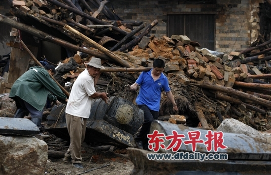 昨日,观山村村民李学良(蓝衣者)和同乡将父母留下的棺材从自家废墟中抬出,以便安葬父母。 早报记者 赵昀 图