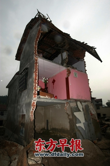 昨日,观山村一栋被山洪冲毁的三层小楼,房间被从中间切了一半。二楼新装修的 房间挂着中国结、摆着鲜花,墙上悬着一个写着“爱”字的时钟。房间的主人是一对新婚夫妇和他们三个月大的儿子,都在山洪泥石流 中不幸遇难。早报记者 赵昀 图