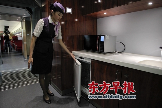 商务车厢内备有微波炉,下有小冰箱。