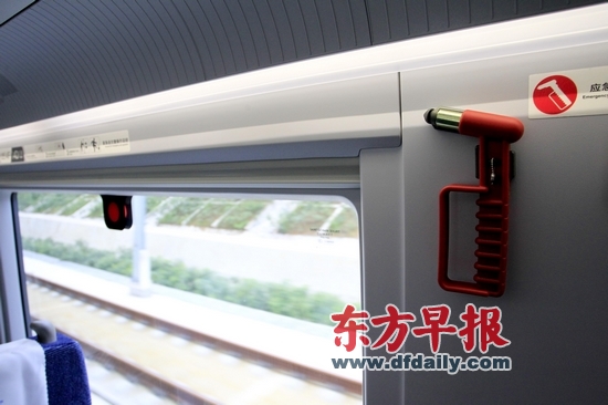 G2次试验列车上安装的逃生用的应急锤。