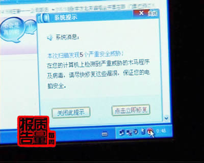 共同打造高质量的生活,欢迎收看《每周质量报告》。随着电脑和网络的普及,现在网络安全成为大家非常关心的一个问题,杀毒软件、或者说反病毒和防病毒的安全软件已经成为网民保护自身上网安全的重要手段。然而,记者在调查过程中却发现,现在有些人居然打起了这些安全软件的主意,打着杀毒的旗号,向用户传递虚假病毒信息,这到底是怎么回事呢?来看记者的调查。