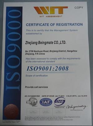 浙江贝因美科工贸股份有限公司呼叫中心于2012年1月17日通过ISO9001:2008质量管理体系认证,并获得中国CNAS和美国ANAB认可的证书。这标志着,贝因美呼叫中心成为国内婴童业界少数通过ISO9001国际质量管理体系的审核、并获得ISO9001:2008质量管理体系认证证书的客户服务中心之一。
