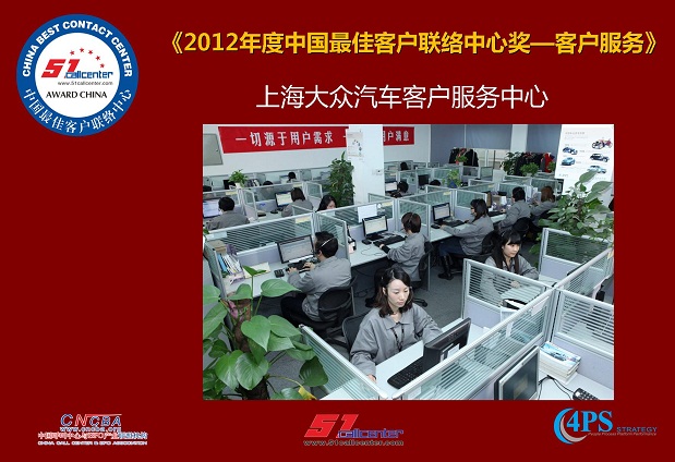 据悉,上海大众汽车客户服务中心在近期举行的”2012年度客户联络中心与CRM评选颁奖典礼”中荣获《2012中国最佳客户联络中心客户服务奖》。目前上海大众汽车客户服务中心员工数量为277名,该中心建立于2001年,服务号码是: 400-820-1111/10106789.同期,上海大众高级经理李宗华当选"2012中国最佳客户联络中心管理人奖"