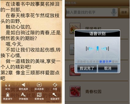 天行听书是应用了捷通华声灵云平台中的语音合成(TTS)、语音识别(ASR)技术的创新之作,它运用嵌入式语音合成技术,无需人工进行预置录音,无论什么文体,都可进行顺畅的海量阅读,调用灵云中的语音合成能力后,这样的海量阅读并不会给手机的存储空间带来负担,即可聆听。您可以选择男声、女声和童声,音质清晰可媲美真人发声,听书已不再成为难事。天行听书软件外观整体设计古朴典雅,仿佛真能闻到书香的气息,这样的视听氛围会立刻带你进入到听书的境界中。独特的翻页模式更具人性化的设计,让人机交互更像真正意义上的翻页读书,字体大小可调节,背景色调柔和舒适。无论是听书,还是看书,都给人带来美好的体验。