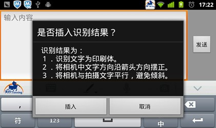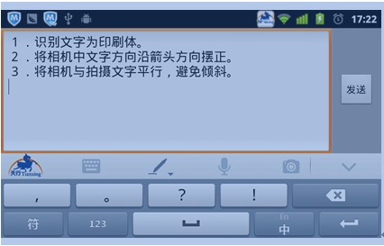 当下载了新版天行输入法后,笔者发现UI设计有了些变化,增加了一个相机模样的图标,是发彩信插入照片用的吗?笔者感到十分好奇,于是点击进入,上边有一行提示信息:请将相机对准拍摄对象并转动手机将方向箭头调整为文字的正方向,这就是传说已久的OCR了吧。立刻有想体验的冲动,笔者对准一个文字印刷文本“咔嚓”一下,选准区域文字,经过短时的等待,刚刚拍摄的文字内容瞬时呈现并可插入短信、邮件等文本中。而插入的文本还可进行编辑,这时可发挥天行输入法强大的编辑功能。为什么说天行输入法编辑功能强大呢?因为它可以动手编辑,更可以动嘴编辑,也可以手和嘴一同编辑,一点都不感到累,反倒更加轻松有趣味。可以说,捷通华声灵云OCR能力的添加成为天行输入法一大特色。是目前手机输入法第一个应用OCR技术的输入法,它大大增强了文字处理能力,也是未来移动办公、移动娱乐的入口。可随时处理文档内容,摆脱空间环境的各种束缚;更可随时将印刷版的文字内容进行摘抄,摘抄后的心得体会利用社交软件分享给更多的人,是爱阅读看书人士的最爱。