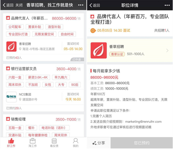 在关于职位的所有介绍信息中,除了诱人的高薪,“表现力强、有幽默感”等对于代言人的常规要求外,尤其值得关注的是,香草特别限定应聘者必须“有过真实的求职经验、懂求职者”,这也是与以往对品牌代言人的要求中十分差异化的地方。