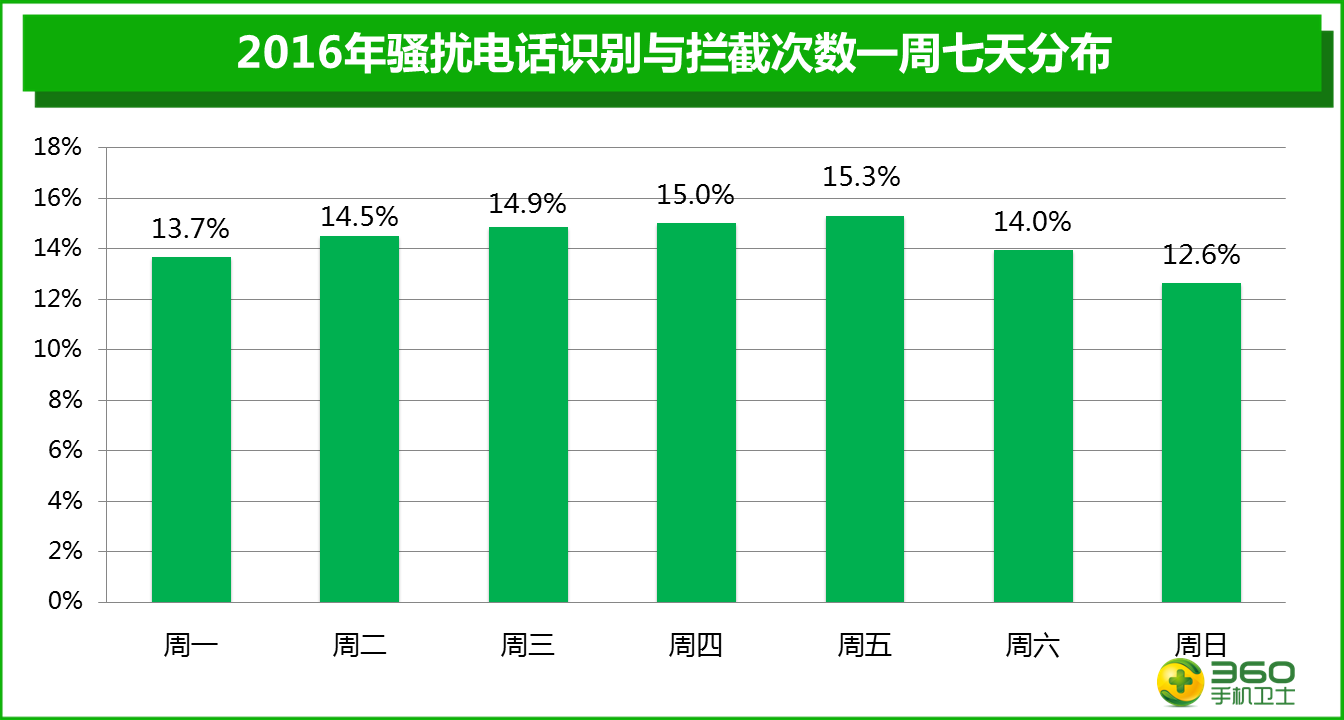 2016年骚扰电话识别与拦截次数一周7天分布。