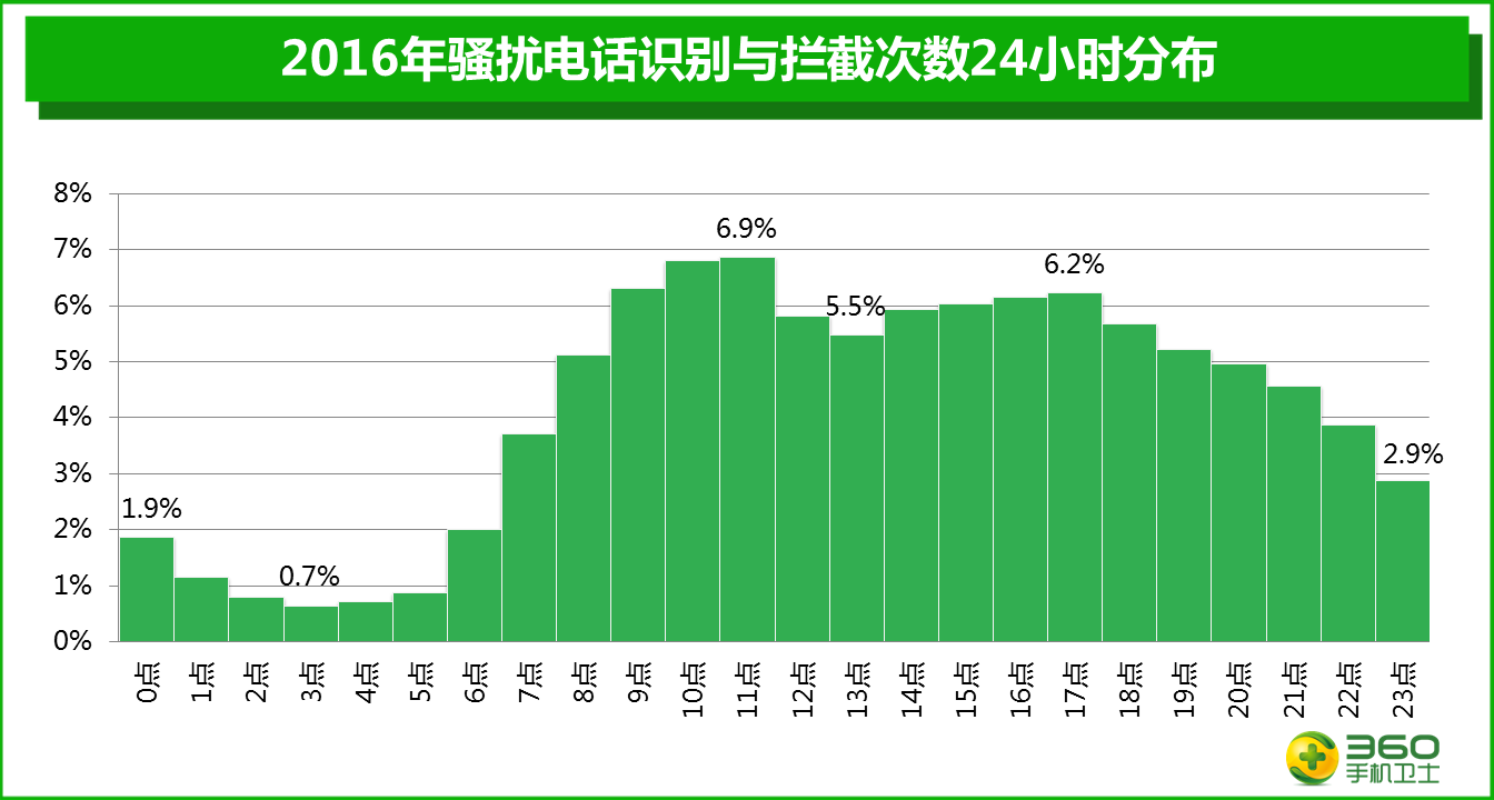 《报告》显示,从一天24小时的情况来看,骚扰电话的高峰期出现在早上8点至11点和下午2点至5点,用户在此期间标记的骚扰电话数约占全天标记总量的一半。