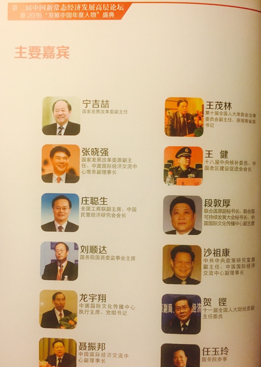 国家发展改革委副主任宁吉喆 、国家发展改革委原副主任/中国国际经济交流中心常务副理事长张晓强、第十届全国人大法律委员会副主任/原湖南省委书记王茂林、全国工商联副主席庄聪生、国务院国资委监事会主席刘顺达、十八届中央候补委员王健、全国政协常委/全国总工会原主席段敦厚、全国人大常委张涛、国务院参事任玉岭等领导出席峰会及颁奖典礼。