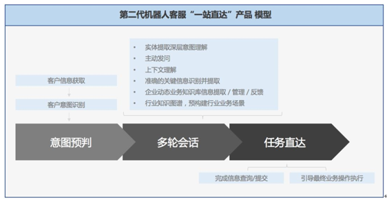 如果将解决客户问题作为最终目的,那么,在第二代智能客服机器人的帮助下,客户无需跳转、换乘,直接搭乘机器人提供的‘服务专车’一站直达目的地,目标明确、过程轻松、需求完成更直接。