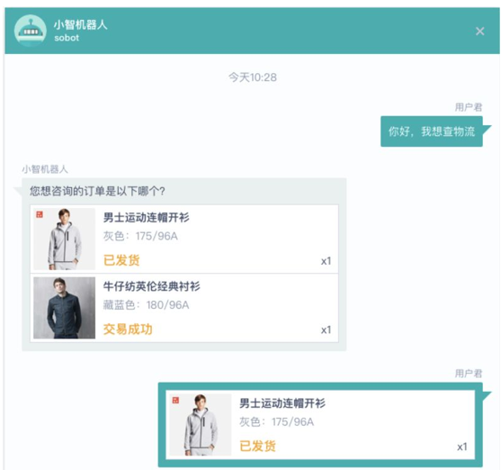 如用户提问“我想查物流?”,机器人通过深度学习,快速获取用户的信息,识别用户意图,主动推送快递订单给用户,供用户查询。