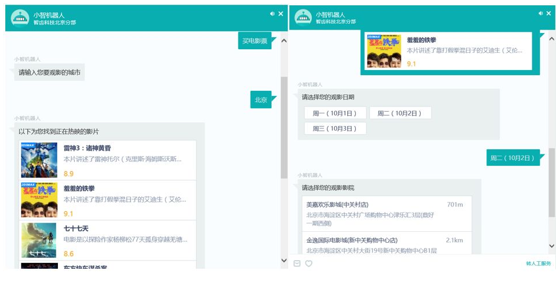 如用户提问 “买电影票?” ,机器人会问 “哪座城市” ,用户说:“北京”,机器人就会推荐相应的电影资讯,用户选择想看的电影后,机器人会再次追问“什么时间段”,用户确定了具体时间,就会得到相应的影院信息推荐,最终帮助用户在短时间内买到电影票。