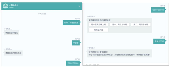 如用户提问 “我要报名” ,机器人会主动发问 “您的姓名” 、“联系电话”及“报名课程类型”,用户说依次回答后,在当前的交互页面完成了报名。