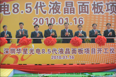 “深圳华星光电8.5代液晶面板项目开工!”2010年1月16日上午10点30分,随着中共中央政治局委员、广东省委书记汪洋的朗声宣布,深圳市华星光电技术有限公司8.5代液晶面板项目在光明新区盛大开工。该项目是深圳市建市以来规模最大的投资项目,也是我国自主建设的、迄今国内最高世代TFT- LCD生产线之一。