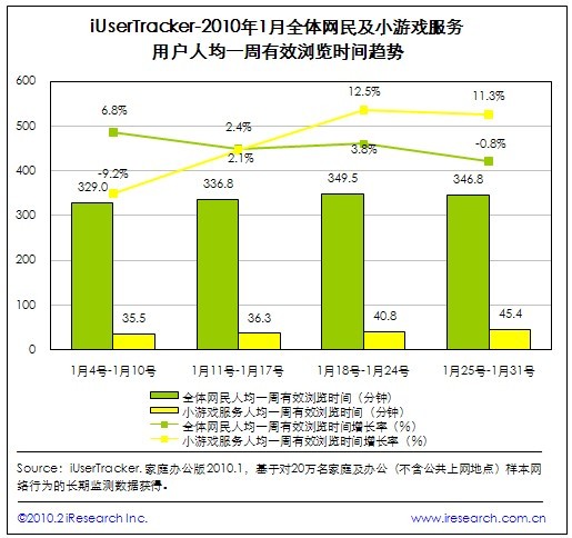 51callcenter2月26日报道(记者:李莎):根据iResearch艾瑞咨询推出的网民连续用户行为研究系统iUserTracker最新数据显示,春节前第二周,1月25号至1月31号期间,家庭及办公用户网民的整体人均一周有效浏览时间开始呈下降趋势,从349.5分钟小幅下降0.8%至346.8分钟。与网民整体浏览行为趋势相反,小游戏服务用户的人均一周有效浏览时间则持续快速上升,连续两周增幅在10%以上。而在元旦结束后的1月4号至1月10号期间,全体网民与小游戏服务人均一周有效浏览时间变化趋势也呈相反态势。