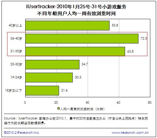 根据艾瑞iUserTracker最新监测数据显示,在小游戏服务不同年龄段用户中,30至40岁用户的黏性最强,人均一周有效浏览时间在一小时以上,40岁以上用户也接近一小时,而30岁以下用户仅半小时左右。