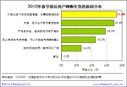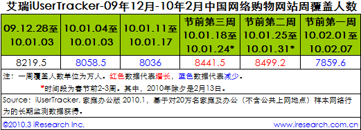 以上是艾瑞关于网购年货的调研数据发布,随后艾瑞咨询将结合自有数据监测产品iUserTracker及电子商务数据监测产品EcPlus,对春节期间购物网站的网民访问行为、及购物网站各环节转化率数据等进行详细解读。敬请关注!