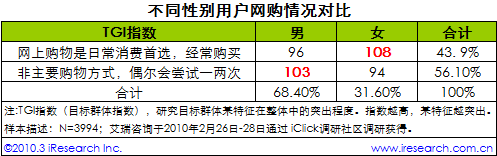 此次调研样本中,男性网购用户的比重为68.4%,女性为31.6%.但是不同性别用户网购行为情况不同,如果分两类来看,A——网上购物是日常消费首选,经常购买;B——非主要购物方式,偶尔会尝试一两次,艾瑞统计发现,A类用户中女性用户TGI 指数较高,说明A类用户中女性用户的密集度高于网购用户整体水平,也在一定程度上说明女性网购用户活跃度相对较高。