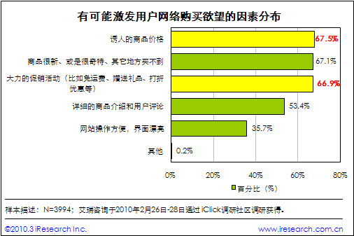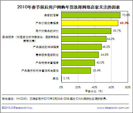 整体来看,中国的网购用户对价格的敏感度偏高,网购基本等同于便宜、优惠,网购年货的原因也不外乎如此。从调研数据来看,用户网购年货的首要驱动因素是各种优惠促销多;同时用户选择网店除了首要关注卖家信誉之外,产品的价格优惠程度是排名第二大因素;诱人的商品价格及促销活动也是激发用户网购的重要因素。