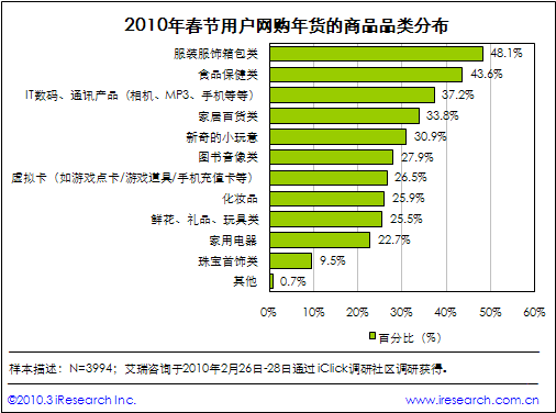 艾瑞网购年货的调研数据显示,网购年货排名TOP3商品是服饰箱包、食品保健、IT数码类产品。而根据艾瑞最新年度网络购物市场调研数据显示,网民购买过的商品TOP3是服饰箱包、图书音像、化妆品及个人护理品。