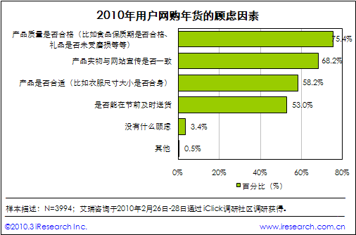 从调研数据来看,产品质量是用户网购年货顾虑最多的因素,超过7成用户都担心质量问题。这也给网络商家提出了要求,特别是年货中食品类居多,质量问题颇为重要。此外,从用户网购年货的商家选择看,除淘宝网C2C平台排名第一之外,几家知名B2C商城的排名均比较靠前。B2C以其较高商家信誉及正品行货等特点,一定程度上可以满足用户对于年货产品质量的要求。
