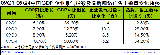 ● 二季度企业运营情况在跌入谷底后持续好转,各行业广告主广告投放预算增长。企业运营情况与宏观经济呈正相关的关系,2009年一季度全国企业景气指数为105.6,较2008年四季度下降1.4点并跌入谷底,但是从二季度开始反弹,大幅上升10.3点;四季度全国企业景气指数为130.6,较一季度提高25.0点,企业运营情况的不断好转。根据艾瑞咨询网络广告监测系统iAdTracker的监测数据显示,2009年一季度中国主流网络媒体的品牌广告主数量为3989个,环比下跌9.8%;二季度则迅速增长至5138个,环比攀升28.8%;2009年全年中国主流网络媒体的品牌广告主数量达11611个,较08年的7641个增长52.0%。