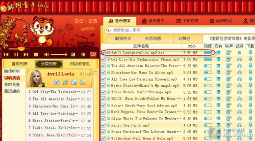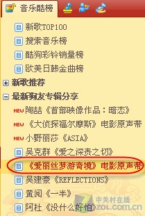 目前只要你登陆酷狗音乐2010版软件,就可以在软件界面右侧的新专题推荐中看到这张专辑的身影,软件提供了这张电影原声大碟的全部14首歌曲,其中第一首便是由艾薇儿演唱的《Alice》,且用户关注度极高。