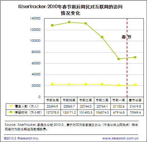 艾瑞咨询分析认为,春节前一周,网民对互联网的访问减少一方面源于节前一周,广大网民集中返程与家人团聚,而走亲访友、清扫房间、制作食品等中国传统新年习俗,都决定了网民在这周的时间内将更多的精力放在了线下活动;另一方面源于部分网民因设备限制,返乡后无法使用互联网服务。而对于春节前第4周网民访问出现高峰,以及春节长假期间,访问出现反弹的现象,艾瑞咨询认为需结合各细分行业具体分析。
