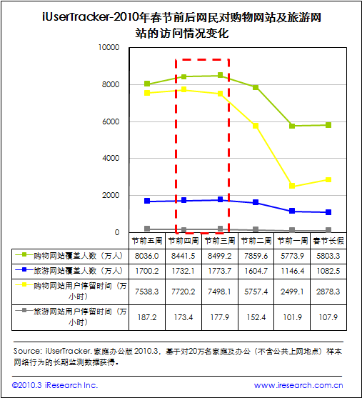 艾瑞iUserTracker的数据显示,购物网站和旅游网站的覆盖人数及用户停留时间,在节前第4周都出现了上升趋势,且从覆盖人数的角度来看,在节前第3周达到最高值。由此,艾瑞咨询发现,由于备置年货以及春节假期旅游的需求增多,网民多选择提前3-4周便开始相关产品的购买或预订,这部分访问是引起节前互联网访问增多的主因。