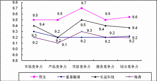 而面向中小型连锁零售企业的管理解决方案,一部分来自于管理软件厂商推出的面向连锁零售特定行业的软件产品,大部分则来自于从零售行业应用软件起家的独立软件开发商,主要供应商有用友、富基融通、长益科技、海鼎、科传、金力等。用友、富基融通和长益科技的综合供应能力较强,而其中用友各项竞争力排名都居首位(见图2)。