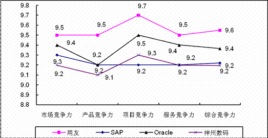 赛迪顾问在经过深入市场调研后认为,面向高端大型连锁零售企业的管理软件产品,则只有用友、SAP、Oracle等少数几家公司能够提供。如若进一步地从产品功能对比、性价比、市场地位、客户覆盖、服务与实施等方面综合评比,则用友的NC集团管控软件都较其他厂商具有相对的比较优势(见图1)。这主要归因于:第一、用友的本土企业背景,使其对中国连锁零售企业集团的管理文化具有深刻的理解,相应的NC产品功能也能很好地契合于用户的统一管理需求;第二、用友管理软件的发展历程使其NC产品一开始就能特别注重后台的集中控制,同时强调前后台的协同工作能力;最后,用友公司自身的服务网络及实施能力能够在客户化二次开发和产品性价比等方面更适应客户的需求,项目实施和后续服务能力很强。而SAP、Oracle等软件厂商在上述三个方面的能力则相对较弱一些。