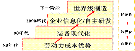 80年代,中国制造以劳动力成本优势为基础,制造出成本相对较低的产品,获得竞争优势。 90年代,经过技术改造,实现装备现代化,很多中国制造企业装备都是世界一流,通过装备现代化提高产量和企业规模。 2000年以后,有两个方面的重要转变,一是企业信息化,二是自主研发。2000年开始,整个中国制造业重点是在进行企业信息化和自主研发,这是中国企业迈向世界级企业非常重要的阶段。 下一阶段,中国制造的目标就是全面升级为世界级制造。从市场化、规模化、国际化等几个方面使中国制造业全面参与国际市场的竞争,而且全面在国际制造业市场里面确定中国制造的核心竞争力。这其中非常重要的两个方面,就是管理升级和整合整个产业链资源的能力。